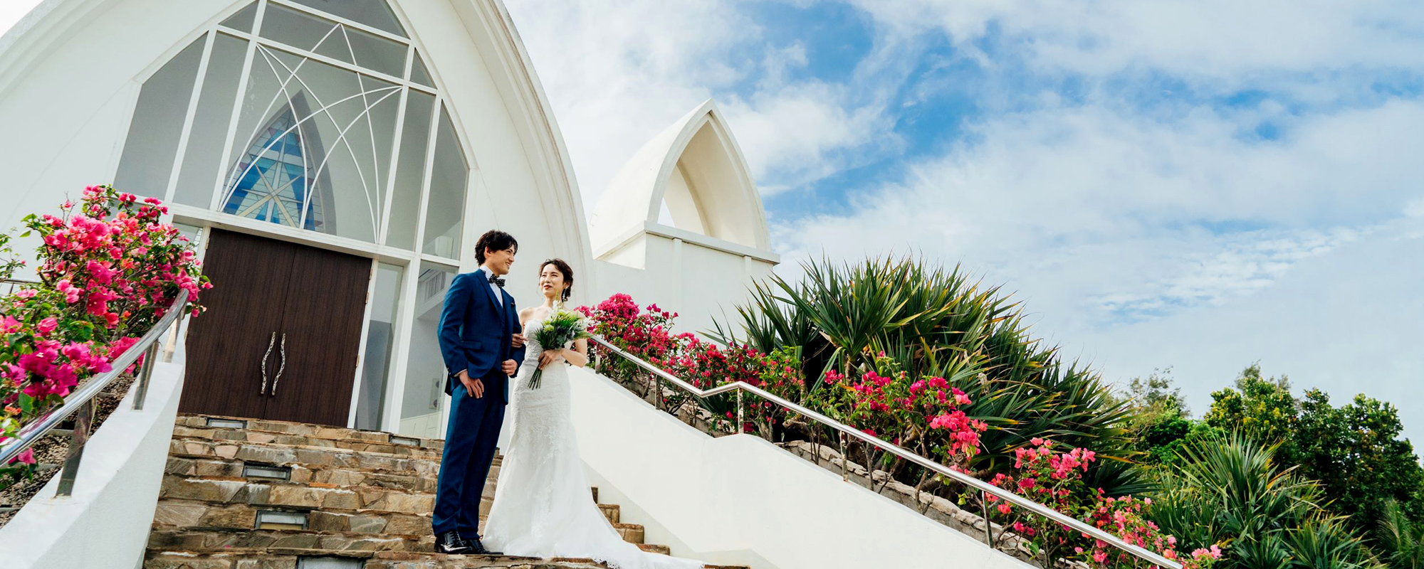 真っ青なバージンロード、ガラス張りの祭壇の先に海が広がる白亜のチャペルで 心に残る特別なフォトウェディングを。